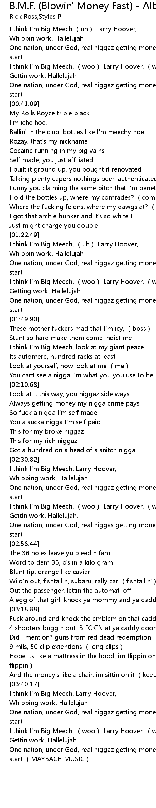 I think Im big meech Larry Hoover whipping work halleluiah one nation under god real niggas getting money from the fucking start. I was given the name two years prior in high school by David D. Rick Ross Uh uh We blowin money fast on this side nigga Catch you up nigga Chorus I think Im Big Meech Larry Hoover Whippin work hallelujah One nation under God Real niggas gettin money from the fucking start I think Im Big Meech Larry Hoover Gettin work hallelujah One nation under God Real niggas gettin money from the fucking start My Rolls Royce triple black Im.